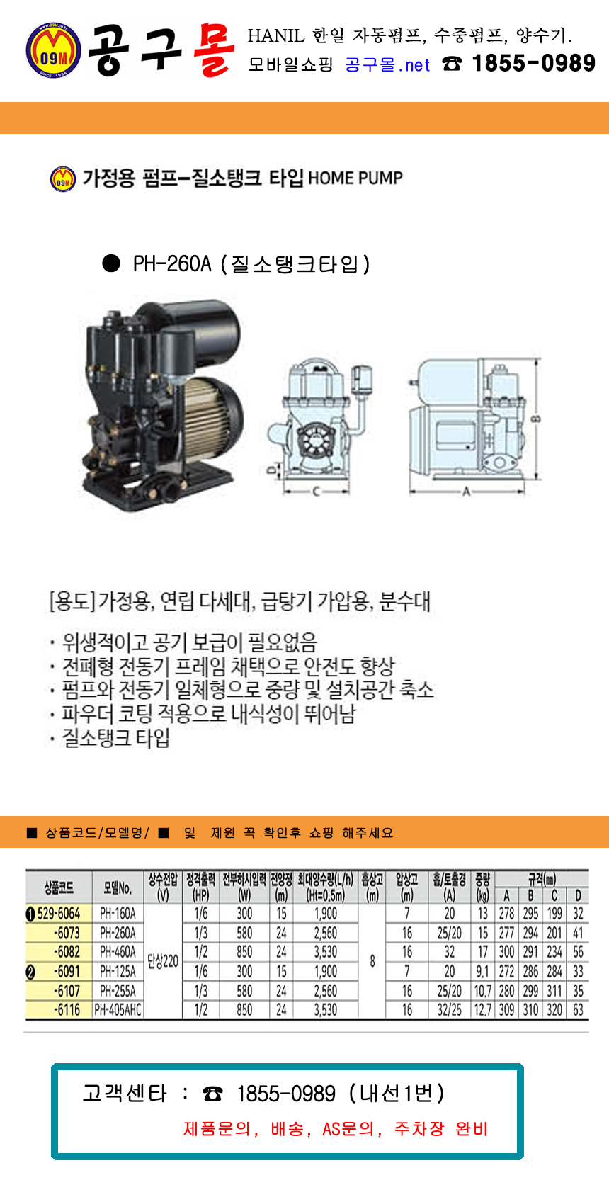 가정용자동펌프 PH-266A(1/3HP,깊은우물용) 한일전기/공구몰/자동펌프