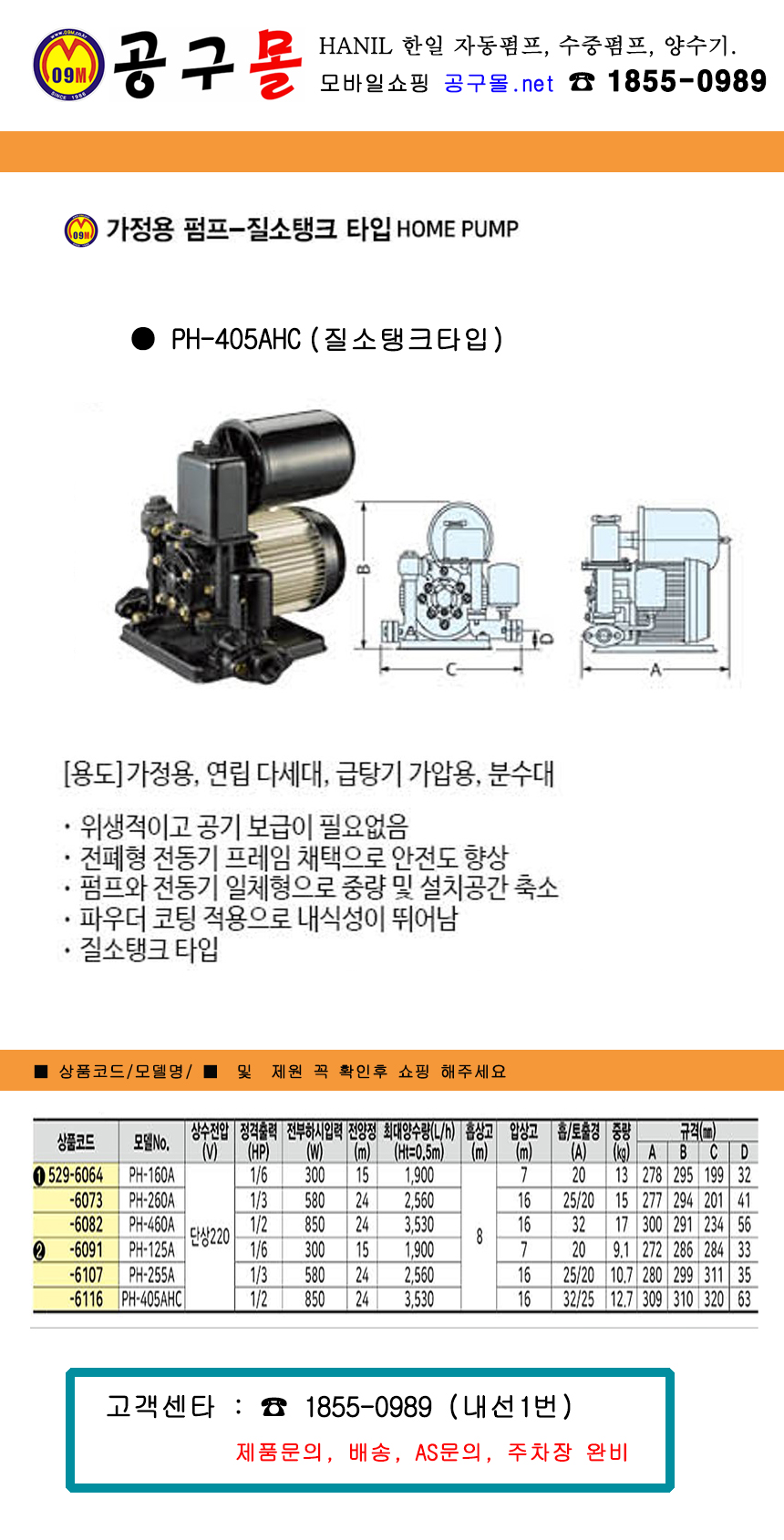한일펌프 가정용펌프 PH-405AHC 1/2HP-220V