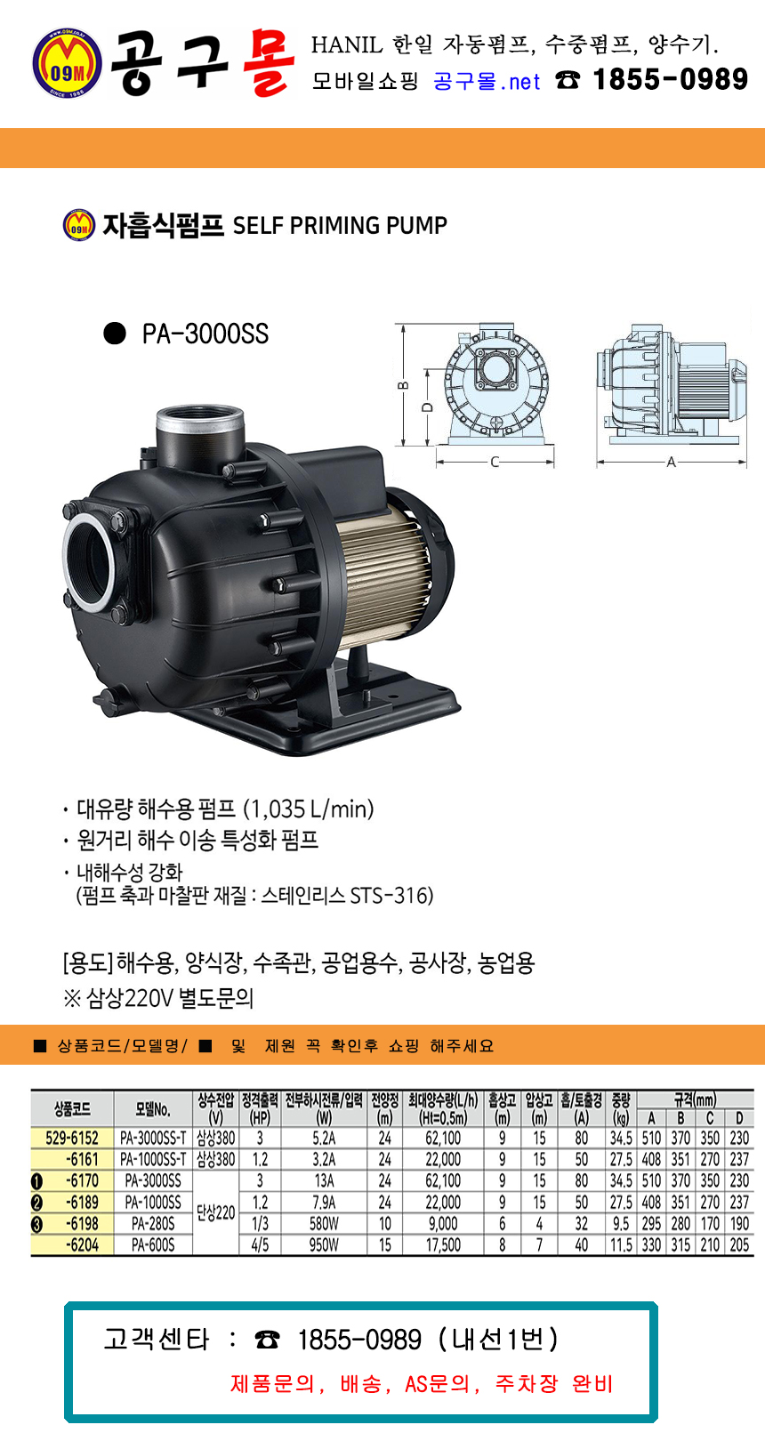 한일펌프 해수용펌프 (자흡식) PA-3000SS 3HP-단상220V