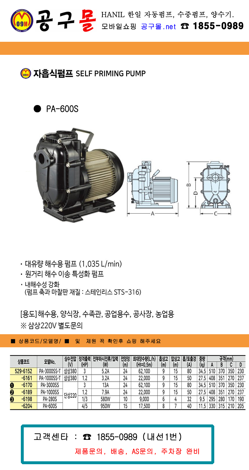 한일펌프 해수용펌프 (자흡식) PA-600S 4/5HP-단상220V