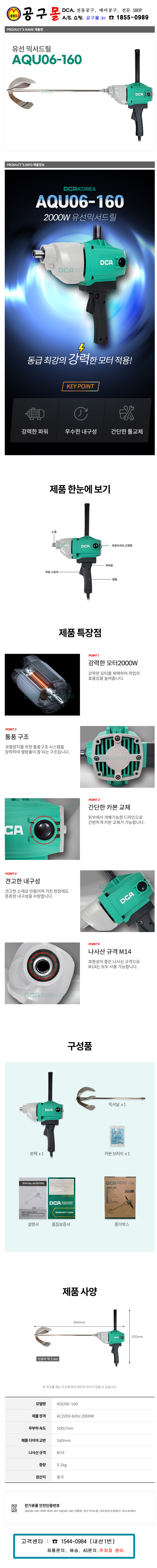 DCA-전기드릴(믹서드릴) AQU06-160 2000W 믹서날포함 전기믹싱드릴 시멘트 혼합