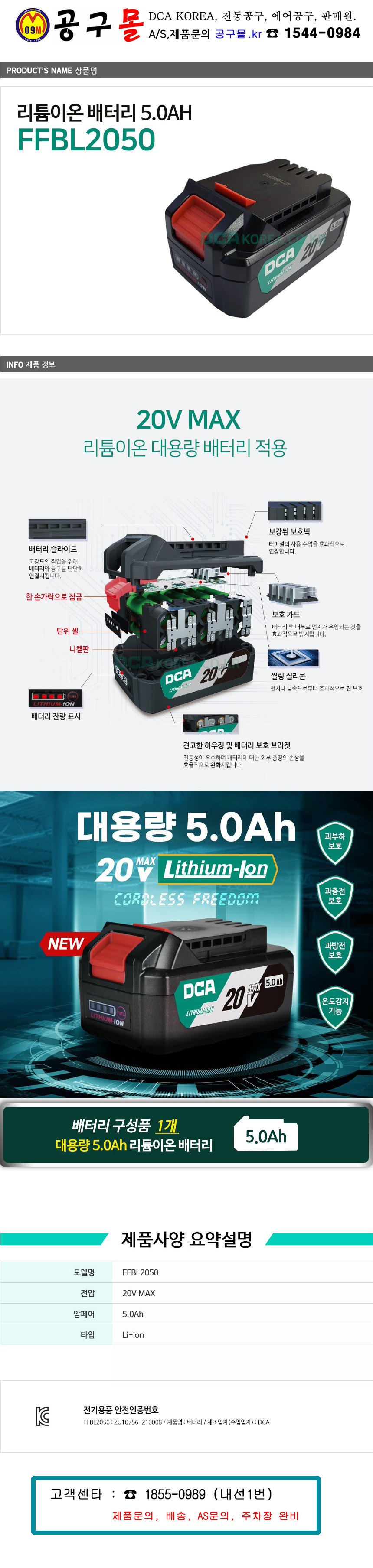 DCA-리튬 배터리 20V-5.0Ah (FFBL2050) 밧데리 잔량 표시 ADJZ2060IEM ADPL208EM DCA KOREA.