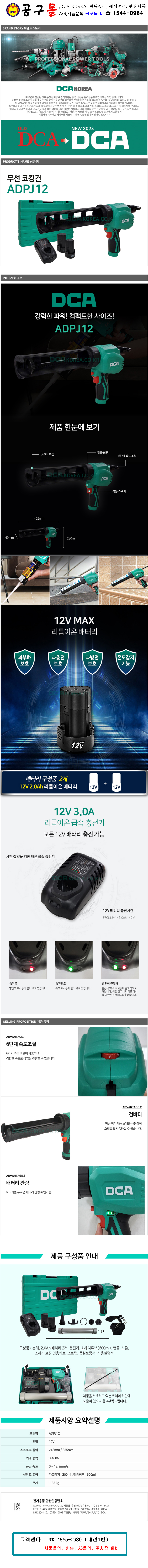DCA-충전실리콘건 ADPJ12 (12V 2.0AH 2팩) 소세지튜브 포함 6단속도조절 무선 코킹건