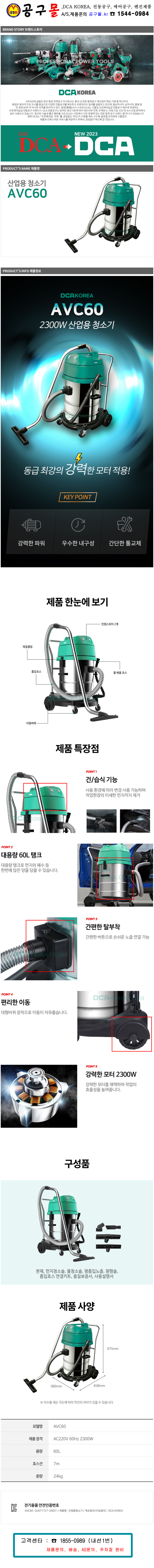 DCA-산업용청소기(건습식) AVC60 220v-2300W 2모터 60L 사무실 체육관 유선 청소기