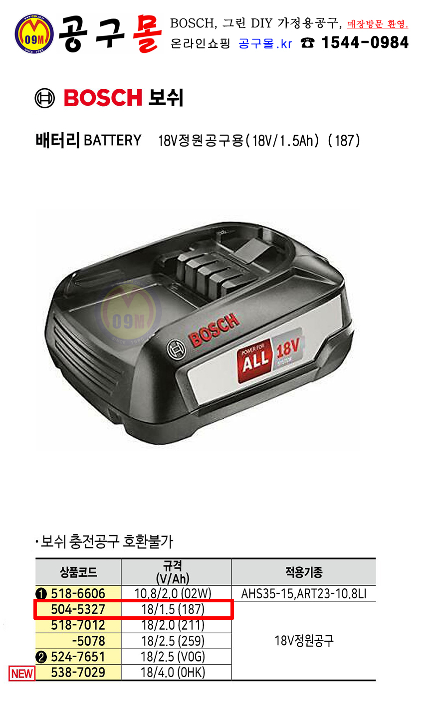 보쉬 18V 배터리 18V정원공구용 1.5Ah (187), 1607A350JM, C504-5327