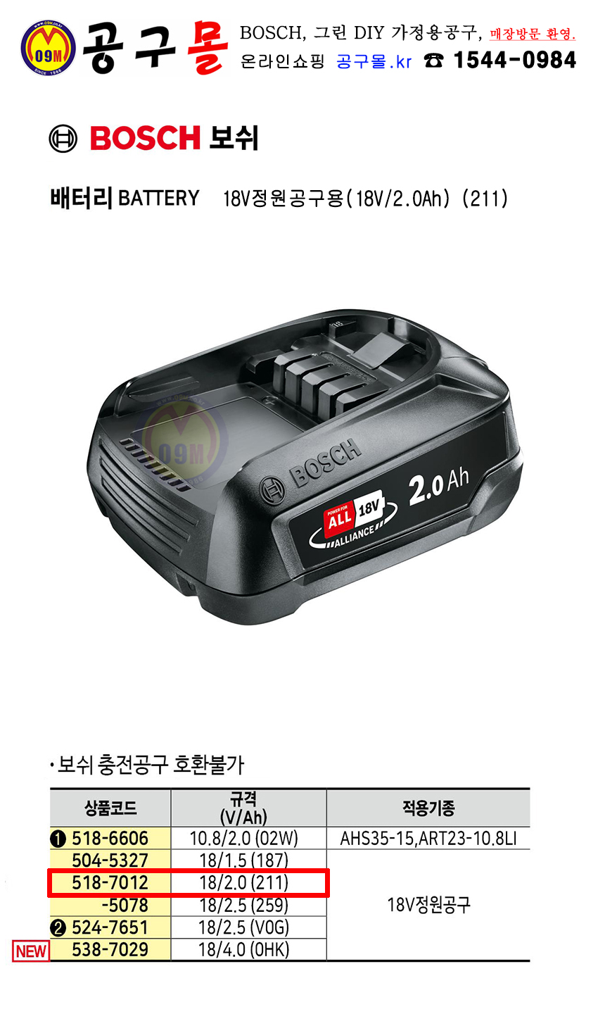 보쉬 18V 배터리 18V정원공구용 2.0Ah (211), 2607337211, C518-7012