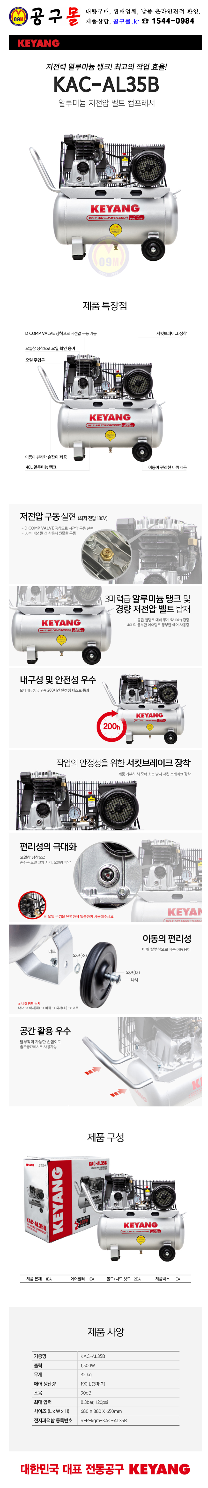 계양 벨트콤프레샤(알루미늄) KAC-AL35B (3HP, 40L, 90dB, 32Kg) 컴프레셔 KEYANG, 공구몰