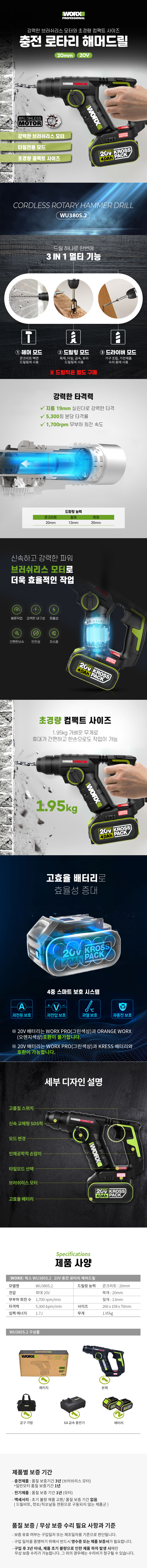 웍스 충전로타리해머드릴 WU380S.2 (20V-4.0AH 2개세트) SDS드릴