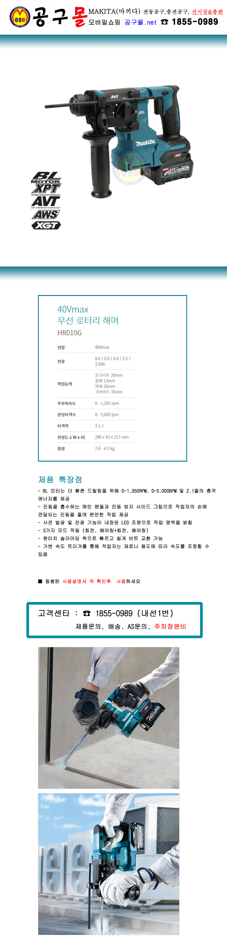 마끼다 40V SDS 로터리해머 HR005GZ (베어툴) 8J (BL, AWS) MAKITA, 공구몰, 충전해머드릴, 해머드릴, 진동드릴