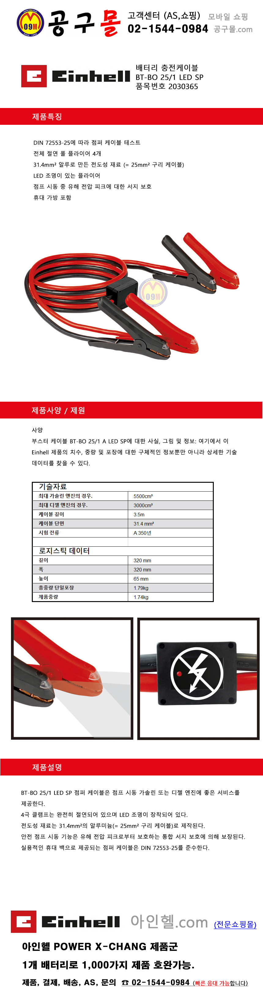 아인헬 배터리 충전케이블 BT-BO 25/1 LED SP, einhell. 공구몰, 점프선, 코리아, 2030365