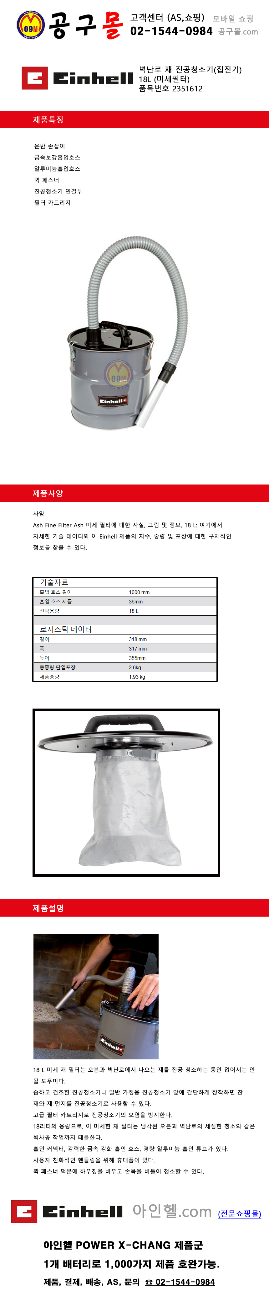 아인헬 벽난로 재 진공청소기(집진기) 18L(미세필터) einhell, 공구몰, 청소기연결사용, 2351612