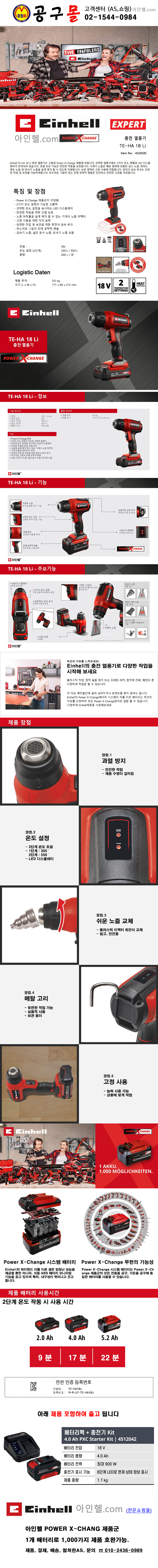 아인헬 충전열풍기 세트 TE-HA18Li(충전기,배터리 4Ah,1B) 2단계 온도조절, Einhell, 공구몰, 4520500/4512042