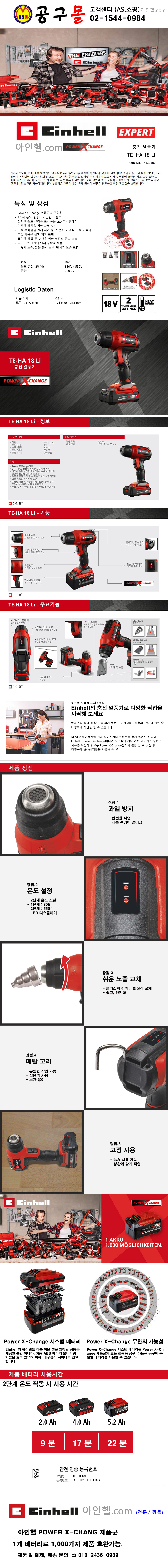 아인헬 충전열풍기 세트 TE-HA18Li(충전기,배터리 4Ah,1B) 2단계 온도조절, Einhell, 공구몰, 4520500/4512042