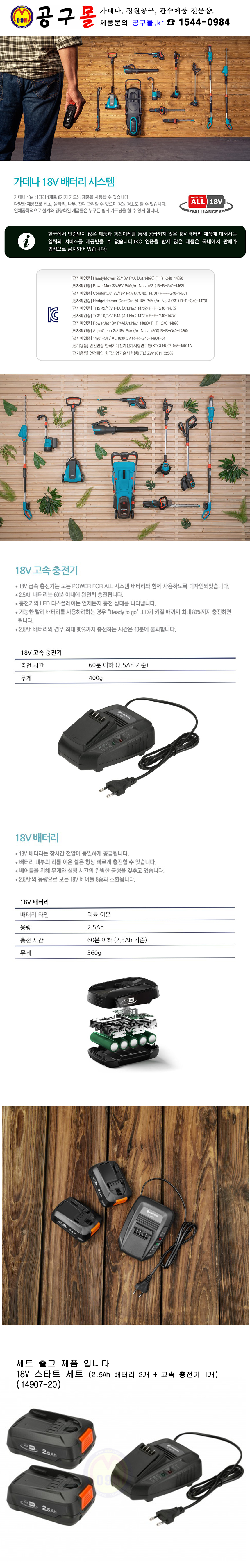가데나 18V 스타트 세트 14907-20 2.5Ah 2개, 고속 충전기 1개, 공구몰