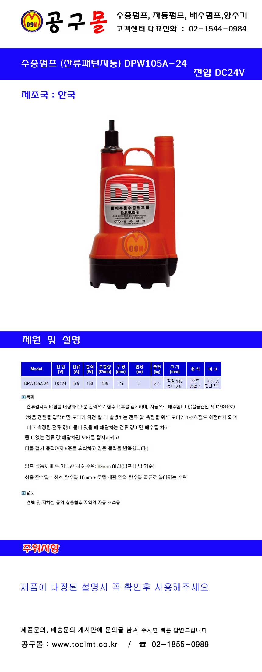 대화전기 수중펌프(자동,중형) DPW105A-24 (DC24V) 대화전기,배수, 워터, 양수기,AC,DC펌프,공구몰, 5290954