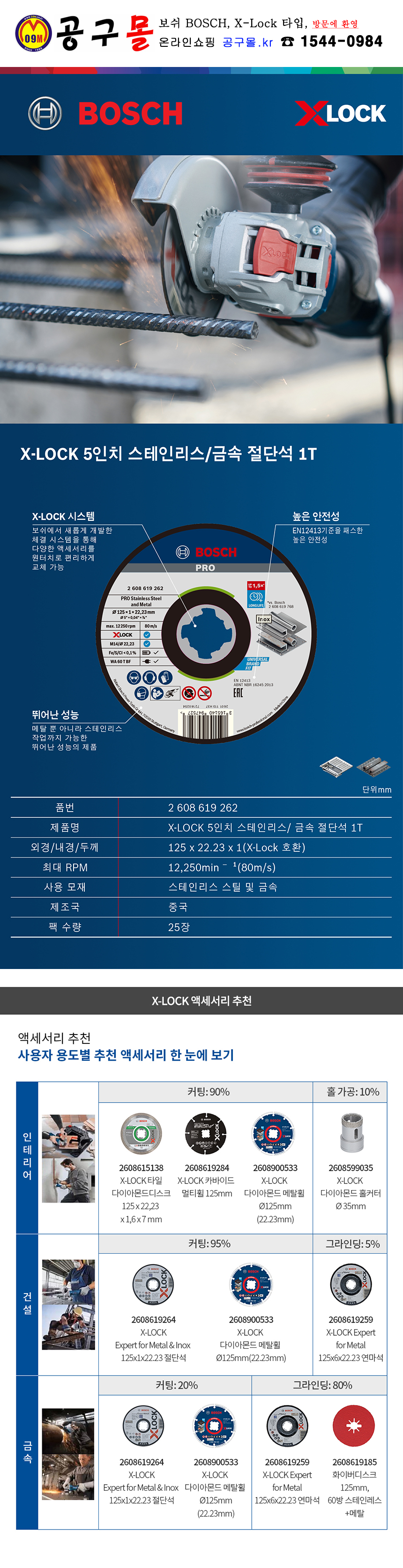 보쉬 X-Lock 절단석(메탈/스테인리스) 125mm x1mm x 22.23mm) 262 공구몰, 2608619262