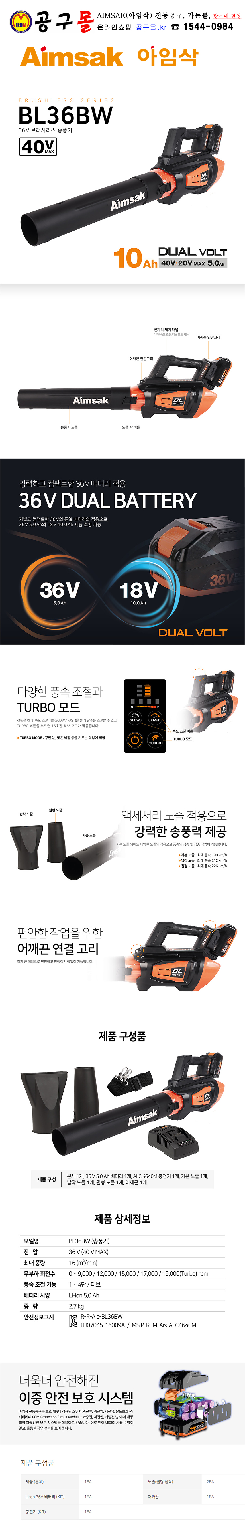 아임삭 충전송풍기 BL-36BW (36V,5.0Ah,1B), AIMSAK, 공구몰, C 508-8182