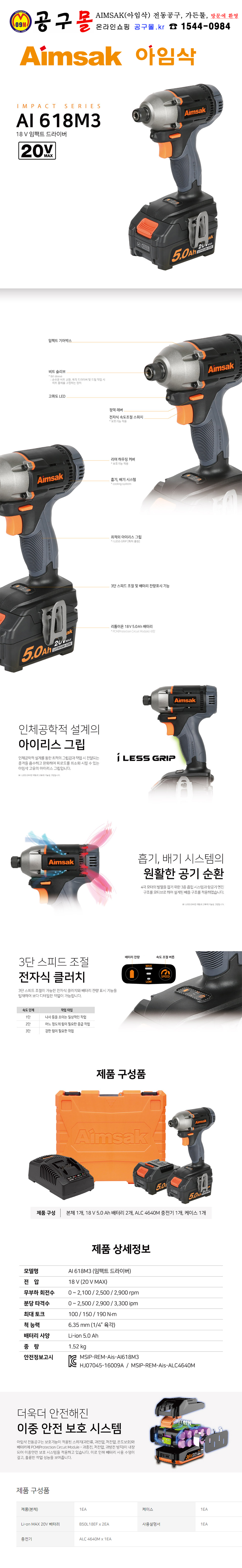 아임삭 충전임팩트드라이버 AI-618M3 (18V 5.0,2B) =20 MAX, AIMSAK, 공구몰, C 508-4520