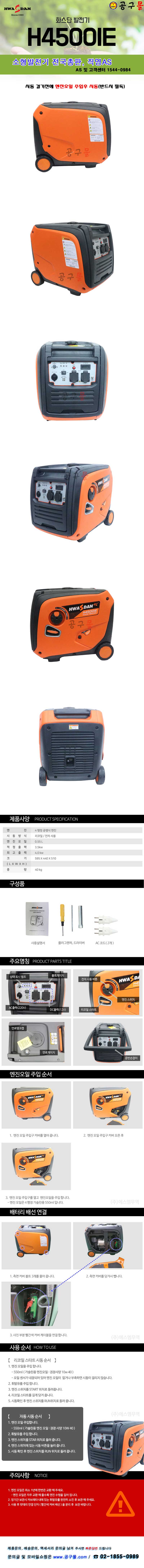 화스단 4행정 발전기 H4500IE 3.5kw,무게40kg, 키시동, 버턴시동, 리코일시동, 공구몰