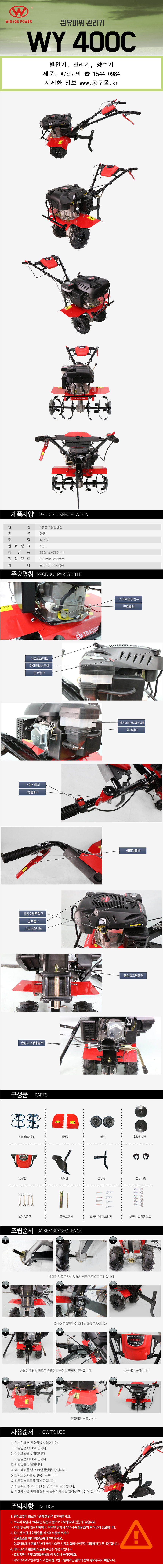 윈유파워 4행정 관리기 WY400C 6HP, 40Kg, 로터리,골타기겸용,깊이150mm-250mm,농업기계 안전검정 완료