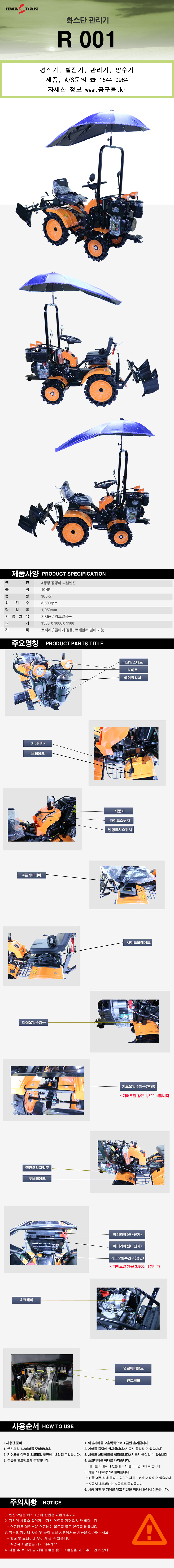 화스단 4행정 경작기 R001 10HP, 380Kg, 로터리, 골타기 겸용, (공구몰