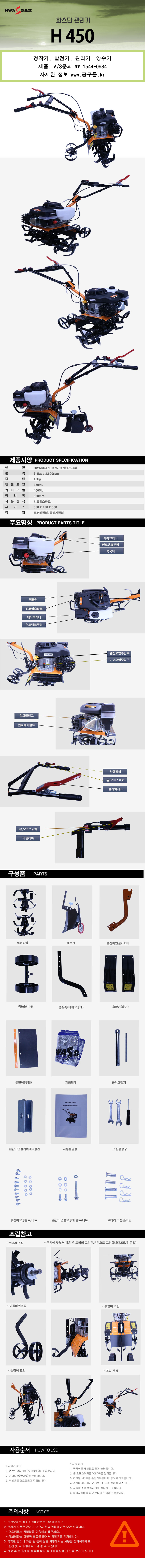 화스단 4행정 경작기 H450-3 3.1KW, 40Kg, 로터리, 골타기, 복토작업 (공구몰