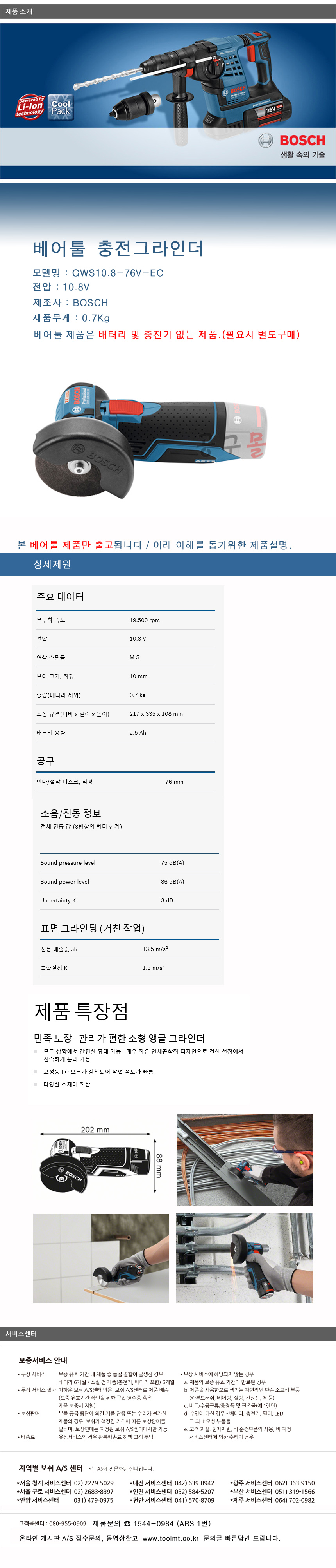 보쉬 10.8V 베어툴 충전그라인더 GWS10.8-76V-EC / 보쉬공구,보쉬전동공구,06019F20B0