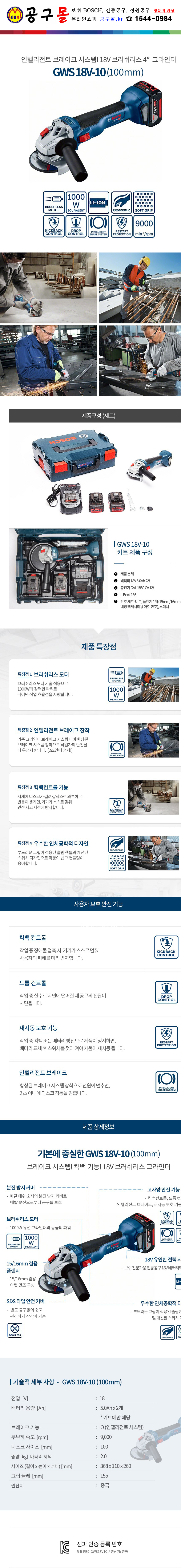 보쉬 충전그라인더 GWS18V-10 (18V/5.0Ah,2B) BL (4), 공구몰, 06019J40B1