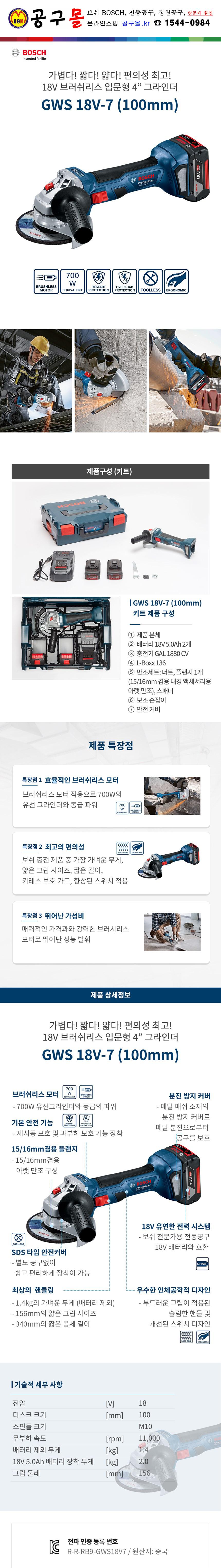 보쉬 충전그라인더 GWS18V-7 (18V/5.0Ah,2B) BL (4), 공구몰, 06019H90B1