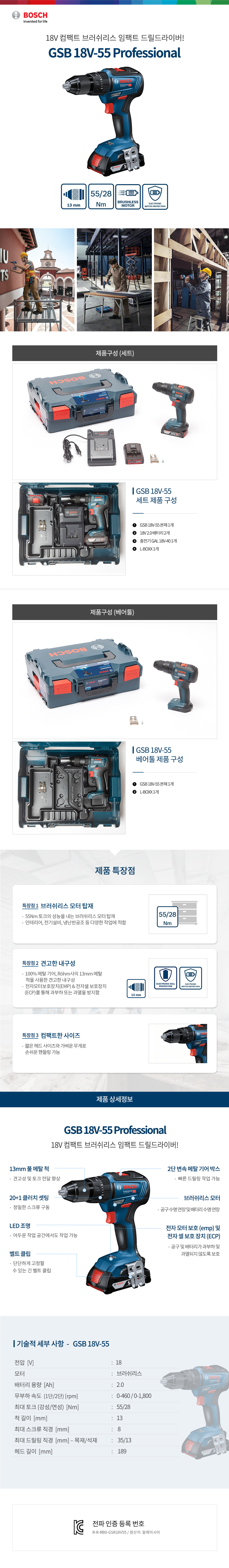 보쉬 충전해머드릴 GSB18V-55 (18V/2Ah) BL 보쉬드릴, 보쉬충전드릴,06019H53B2