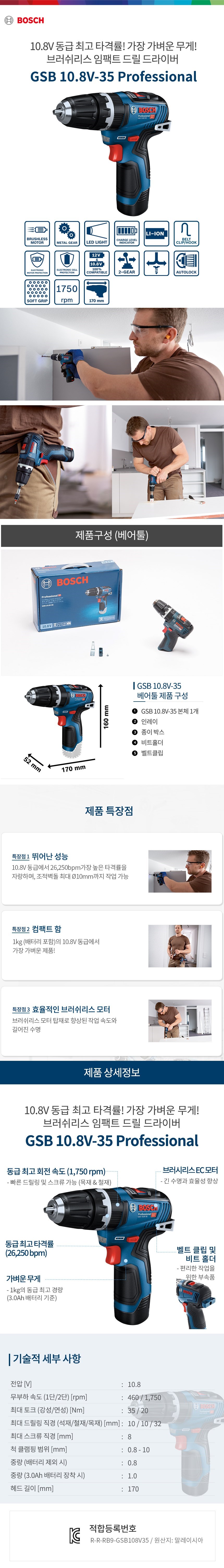 보쉬 충전햄머드릴 GSB10.8V-35 (10.8V/3.0Ah) BL 충전해머드릴,06019J90B1