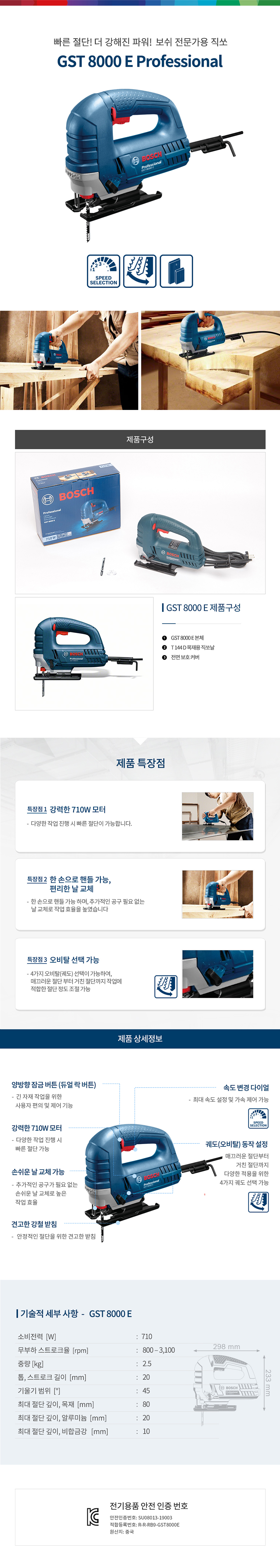 보쉬 직쏘 GST8000E (710W) BOSCH, 직쏘기, 직소기, 지그톱,곡선톱, 060158H0B1