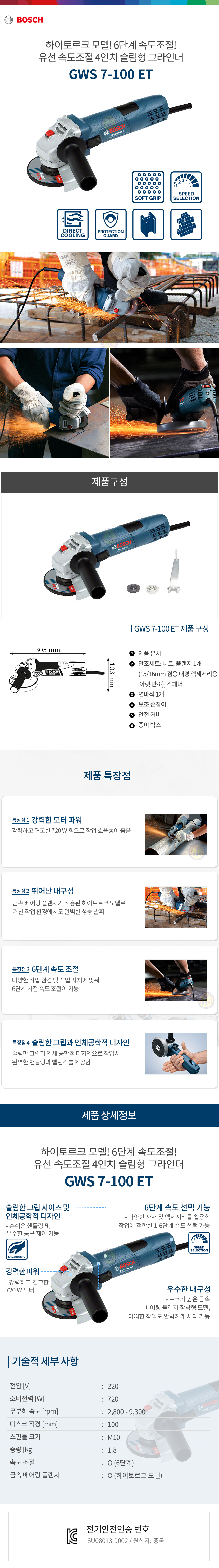 보쉬 슬림 앵글그라인더 GWS7-100ET (720W, 100mm) 디스크그라인더,06013885B0