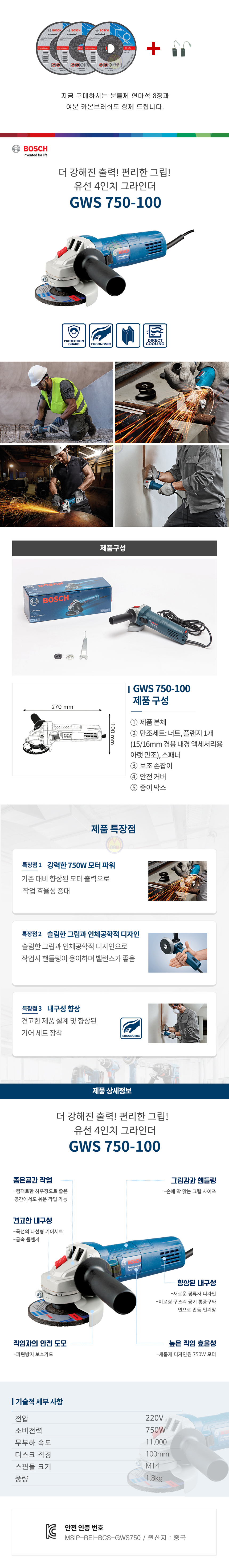 보쉬 그라인더 GWS750-100 (750W 100MM) 앵글그라인더,보쉬그라인더,06013940B2