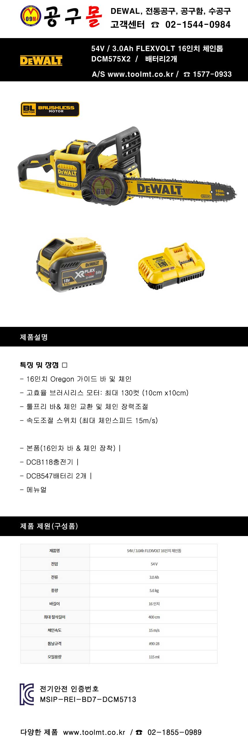 디월트 54V 충전체인톱(16) DCM575X2 (3Ah 2개) dcm5713n,DEWALT, FLEXVOLT, DCM575N, 충전톱, 전기톱, 울산공구몰,C510-2233