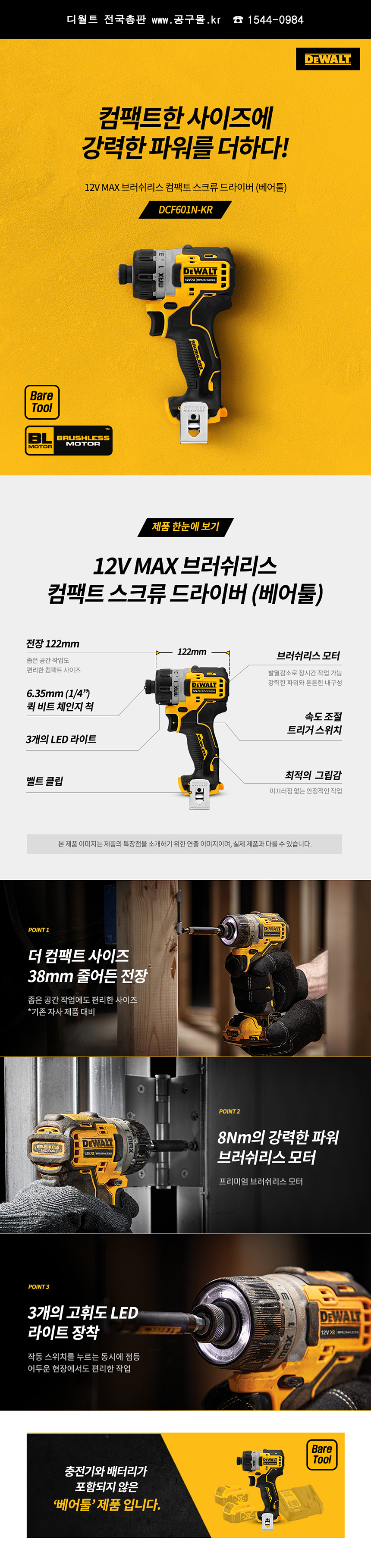 디월트 충전스크루드라이버 DCF601N(베어툴) BL (10.8V), 공구몰, C510-4921