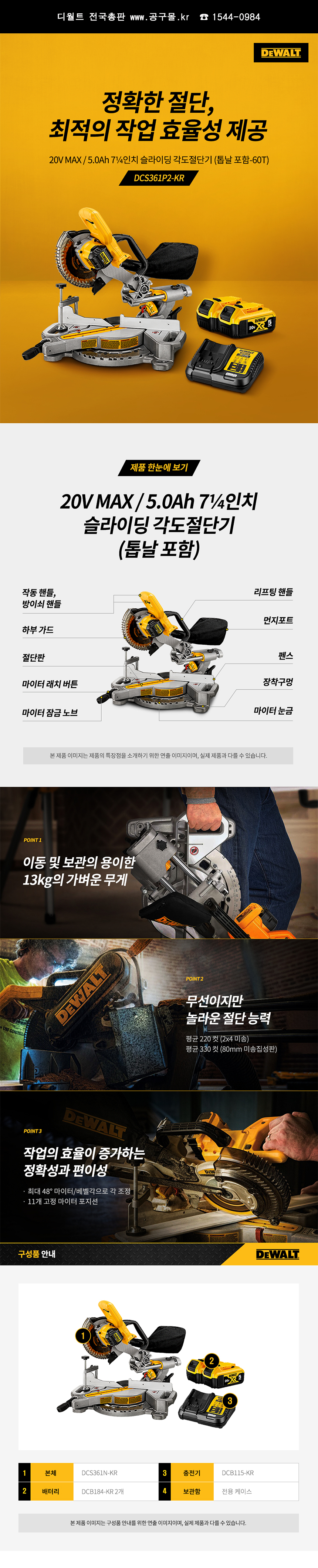 디월트 충전각도절단기(슬라이드) DCS361P2 (18V/5.0Ah) (7 1/4), 공구몰, C509-1928