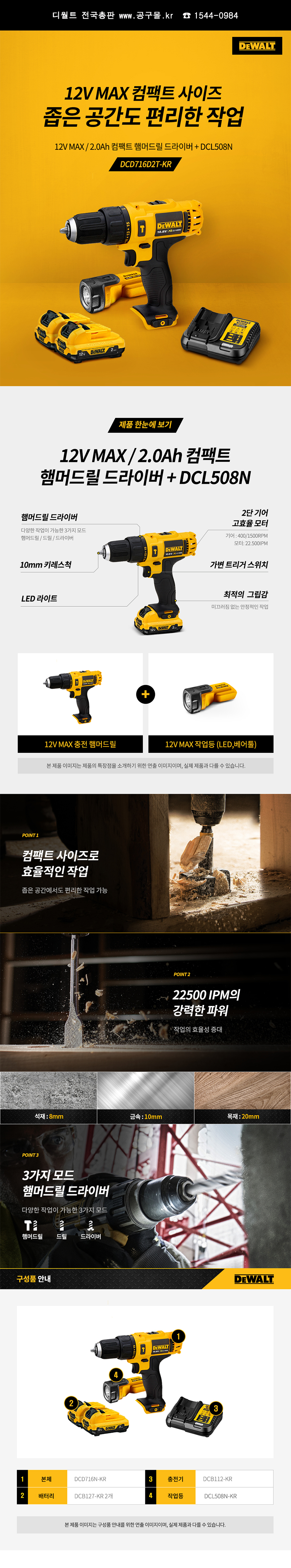 디월트 컴팩트 햄머드릴DCD716D2T(10.8V/2.0Ah) DEWALT,디월트,해머드릴 ,충전드릴C510-1915