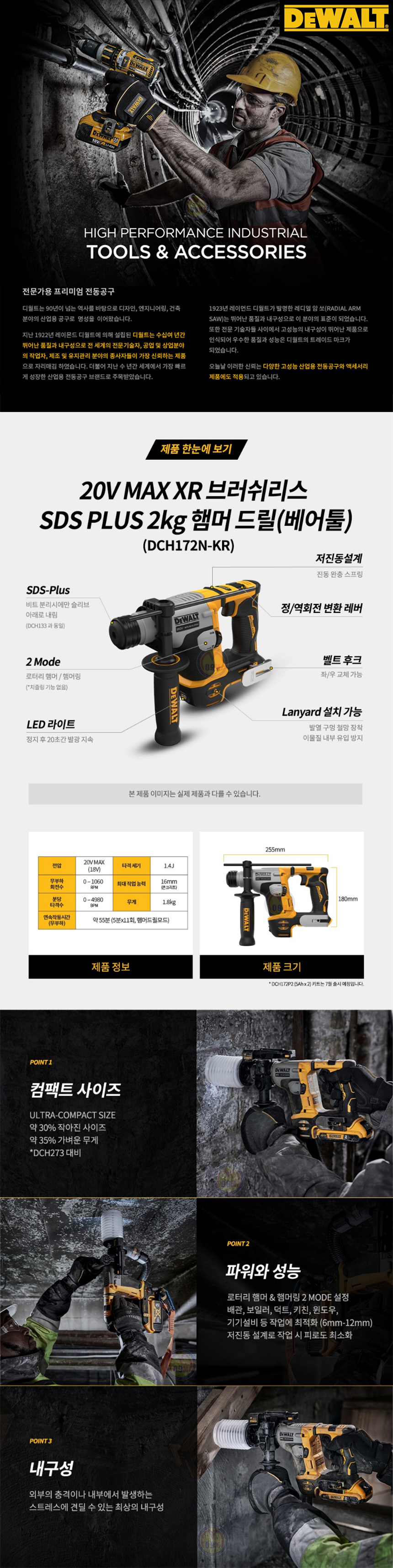 디월트 20V 충전햄머드릴 DCH172N (베어툴) SDSPLUS 2KG 햄머 해머드릴 함마드릴,C510-7186