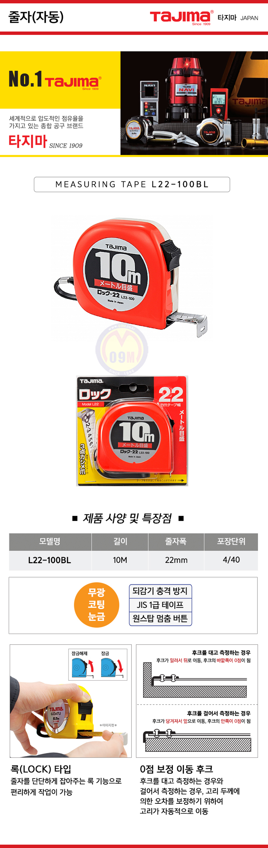 타지마 줄자(자동) L22-100BL(10Mx22mm) TAJIMA,141402450244