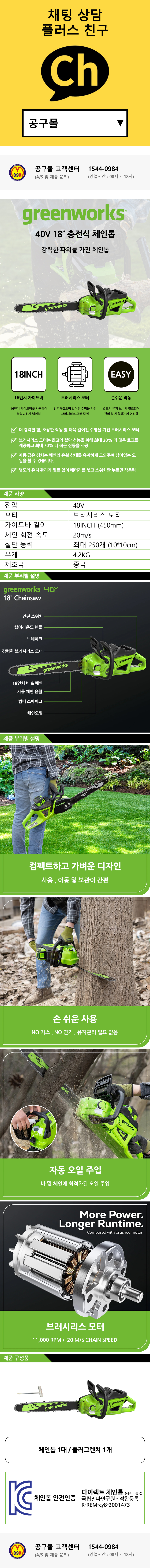 그린웍스 충전체인톱 (18) 40V 베어툴 무선체인톱 충전톱