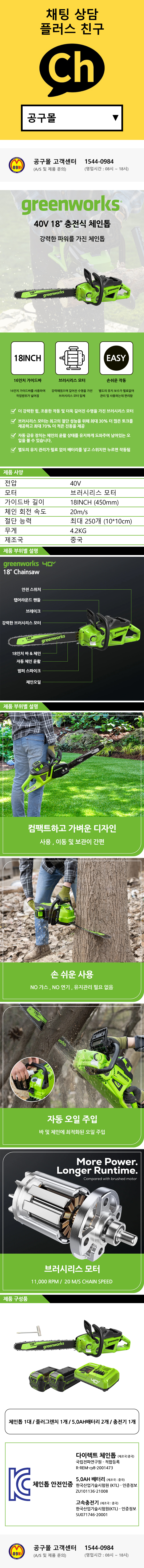 그린웍스 충전체인톱 (18) 40V (5.0AH 2팩) 무선체인톱 충전톱