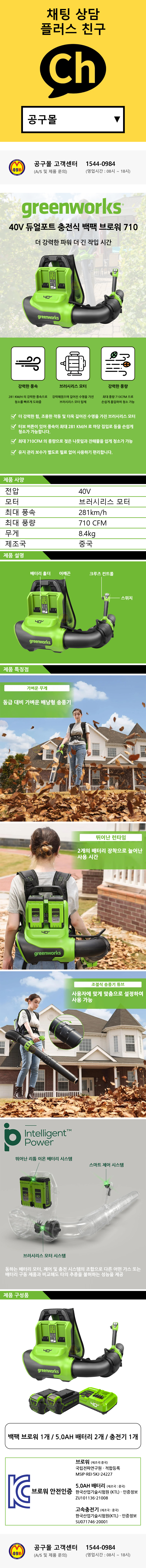 그린웍스 듀얼포트 백팩브로워 710 40V (5.0AH 2팩) 충전브로워 낙엽청소기
