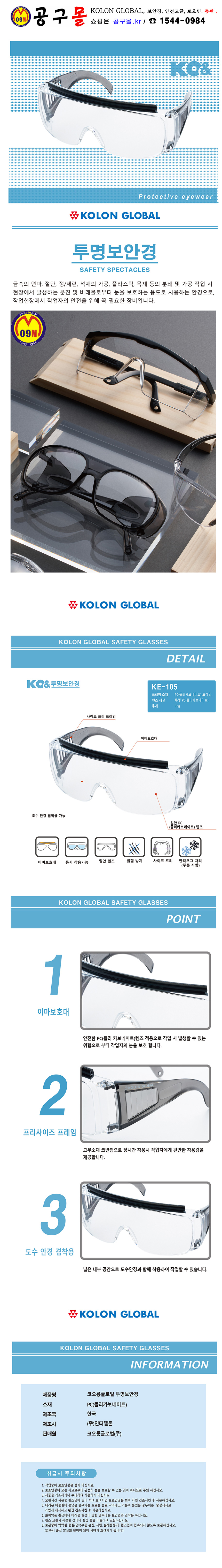 보안경(투명) KE-105, KOLON GLOBAL, 코오롱글로벌, 공구몰, KE105