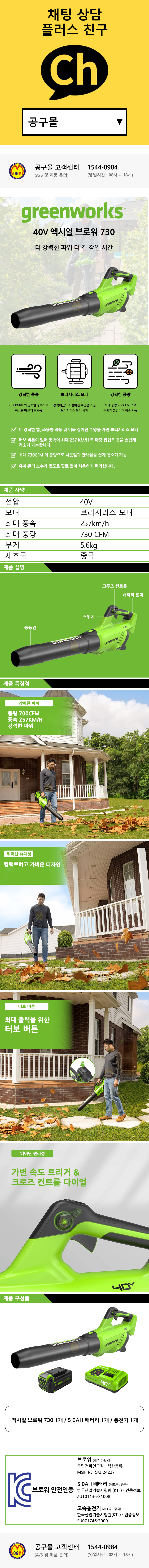 그린웍스 Axial(엑시얼) 브로워 730 40V (5.0AH 1팩) 충전브로워 송풍기 낙엽청소기