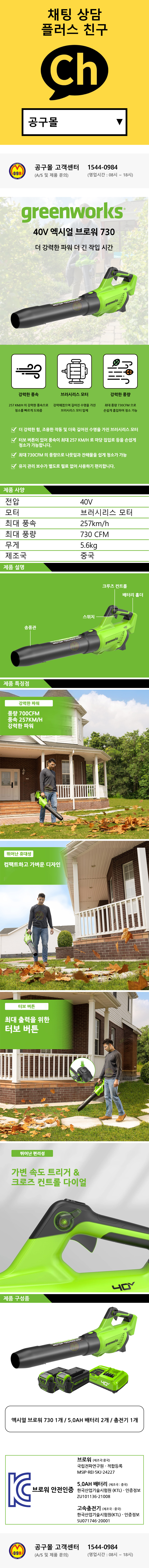 그린웍스 Axial(엑시얼) 브로워 730 40V (5.0AH 2팩) 충전브로워 송풍기 낙엽청소기