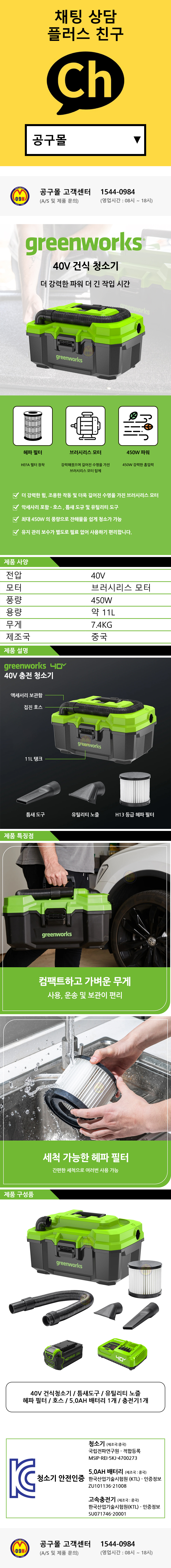그린웍스 충전청소기 (40V 5.0AH 1팩) 헤파필터 진공청소기