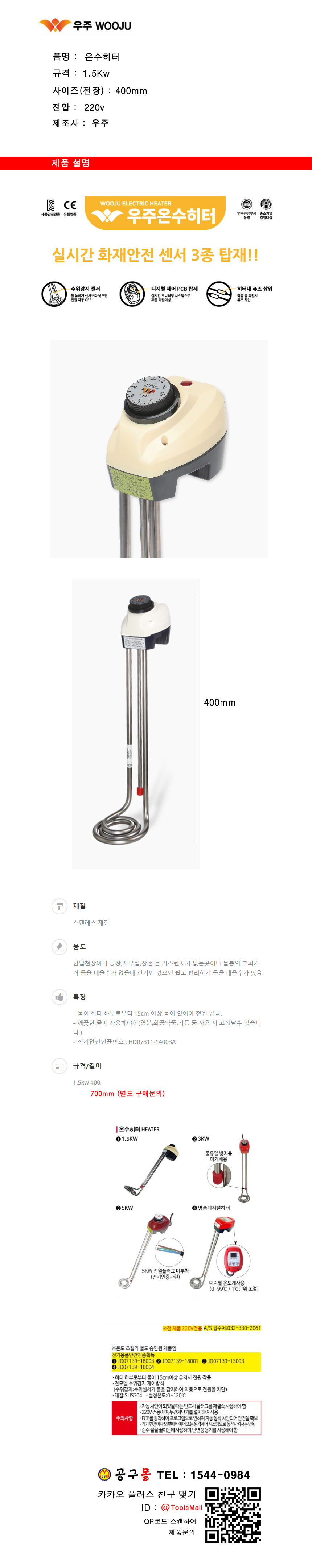 우주 온수히터 1.5KWx400mm (스텐레스) 물히터, 공구몰,W877-3944