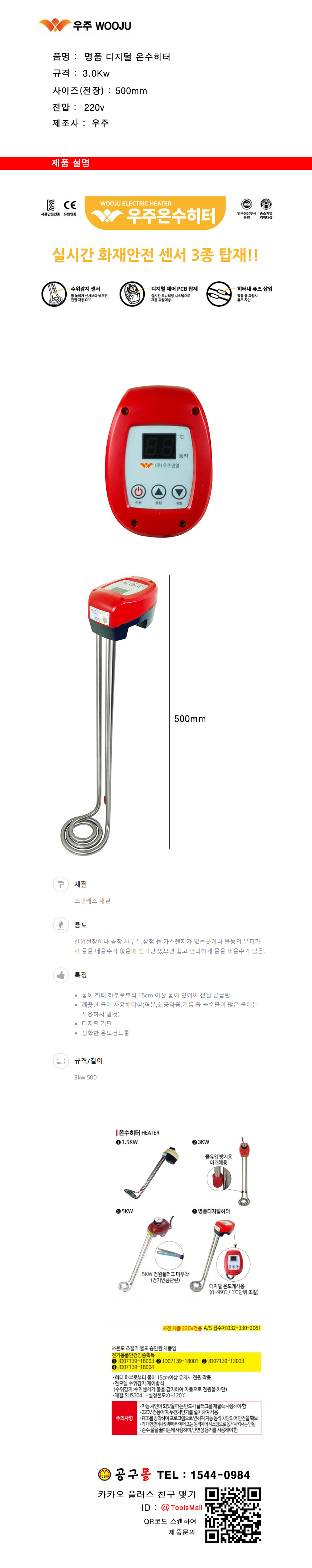 우주 디지털 온수히터 3KWx500mm (스텐레스) 물히터, 공구몰,W877-9814