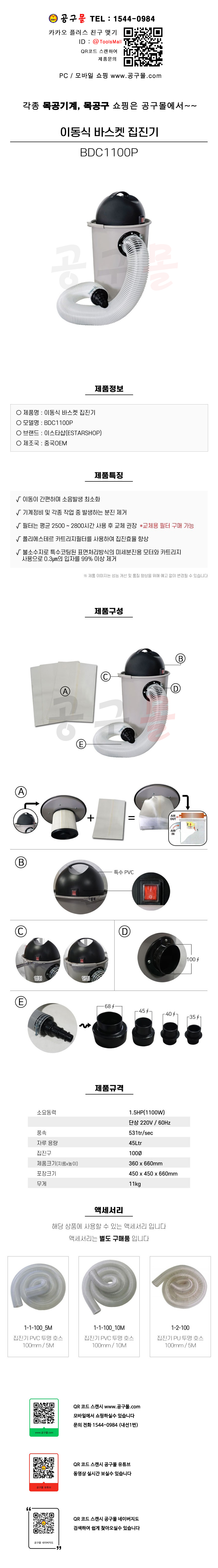 KR산업 이동식 집진기(목공용) BDC1100P 1.5HP, 11Kg 공구몰, 바스켓집진기, 목공기계